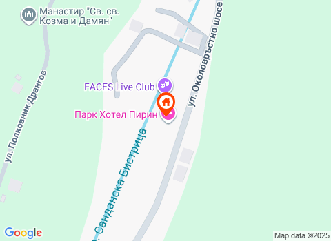 Парк хотел Пирин 5* е елегантен хотелски комплекс, разположен край устието на живописната река Санданска Бистрица, до прохладния парк на град Сандански, един от най-добрите балнео курорти в България.