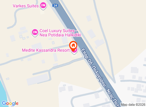 Разположен на първия ръкав на п-в Халкидики, между Неа Мудания и Неа Потидея, с изглед към кристално чистите води на Егейско море, Medite Kassandra Resort 5* е нов луксозен хотелски комплекс, съчетаващ по уникален начин спокойствие и естетика.