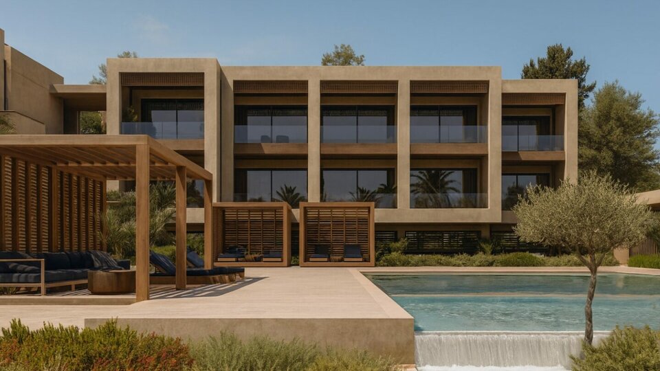 Вдъхновена от спокойния ритъм на морето и чистотата на естествените материали, архитектурата на комплекса съчетава изчистени модерни линии с меки, земни тонове.