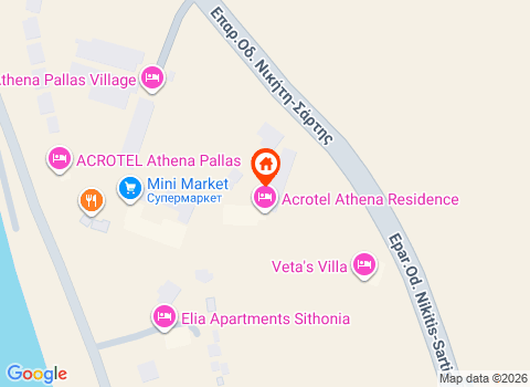 Acrotel Athena Residence 5* е разположен на втория ръкав на п-в Халкидики - Ситония, на 8 км от Неос Мармарас и на 11 км от Никити.